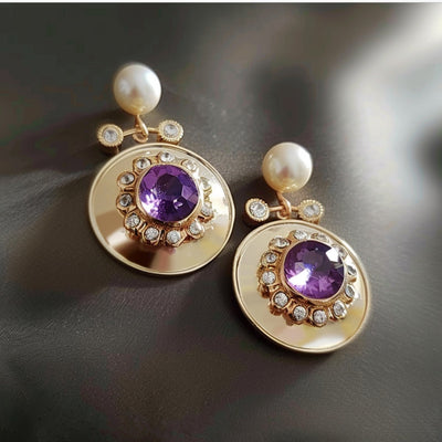 Rounded Golden Purple Zirconia Pearl Earrings