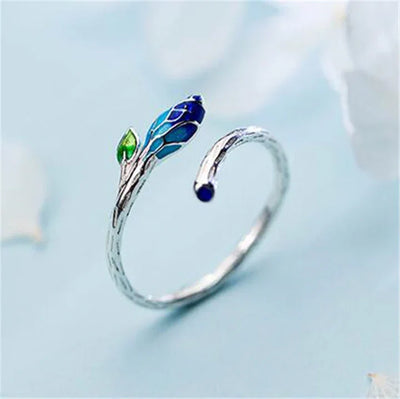 Adjustable Leaf Ring with Blue Enamel in Silver